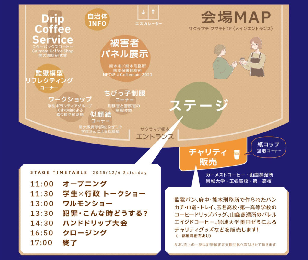 今年は更に熊本県警察が参加します。コーナーとして新たに刑務官と警察官キッズ制服。ゆるキャラショーも予定しております。府中刑務所から受刑者が作業で作ったマグカップなど配布など盛りだくさんとなっております。犯罪を減らすために皆さんと共に考えていくイベントとなります。
