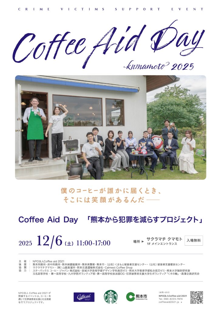 2025年12月6日(土)に今年も「Coffee aid day Kumamoto 2025」をサクラマチクマモトエントランスにて開催しました。「熊本から犯罪を減らプロジェクト」をテーマに、各行政機関として、熊本刑務所、府中刑務所、熊本保護観察所、熊本県警察、熊本市、くまもと被害者支援センターが参加。来場者約3000人となり、命の大切さ、罪を犯すことの不利益さを伝れたかなと考えております。引き続き啓蒙活動を続けて参ります。